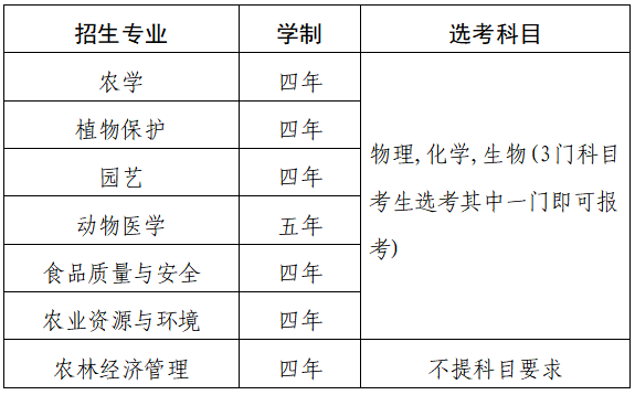 招生专业包括农学、植物保护、园艺、动物医学、食品质量与安全、农业资源与环境、农林经济管理等7个本科专业,全部安排在高校招生普通类提前录取,招生代码:0211。