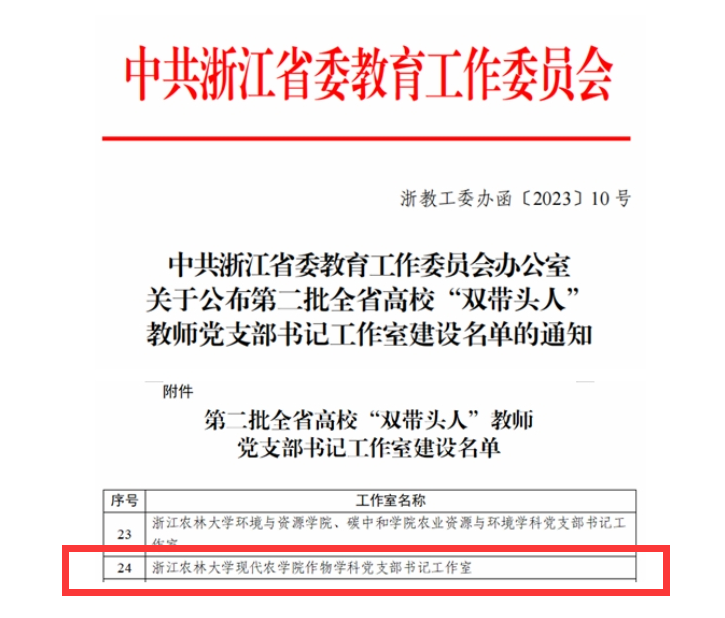 近期,浙江省委教育工委公布了第二批全省高校“双带头人”教师党支部书记工作室建设名单,公司作物学科党支部获批建设。