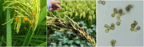 根据为害特点,员工在稻穗上发现了稻曲病,被压弯腰的稻子,走近看才发现穗上挂满了黄色、墨绿色的稻曲球;在稻株茎基部发现了云形大斑的纹枯病。另外,员工发现了稻瘟病中的谷粒瘟和叶瘟,辨析了不同病斑类型的叶瘟:慢性型病斑、急性型病斑、褐点型病斑。