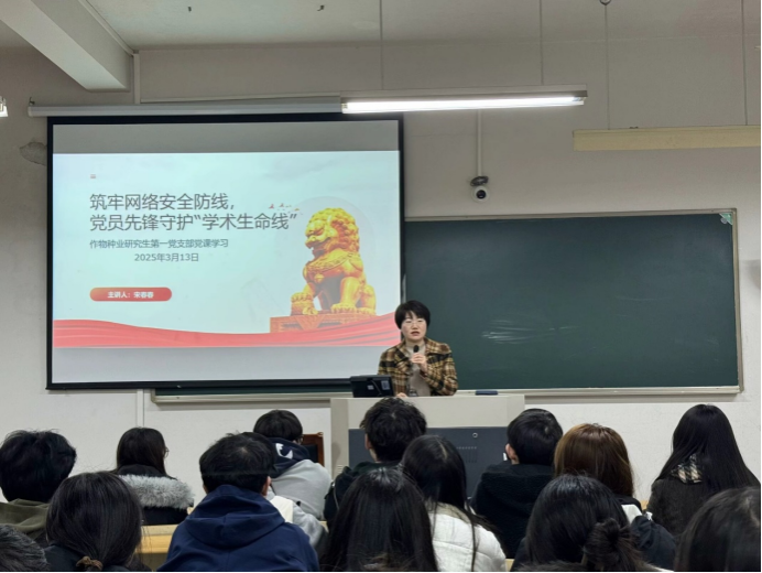为深入学习贯彻习近平总书记关于网络安全的重要论述,提升研究生党员网络安全防范意识。3月13日,作物种业研究生第一党支部在学2-312开展了主题党课学习活动。作物种业研究生第一、第二党支部87余人,参加学习。活动由支部书记林雨萱主持。