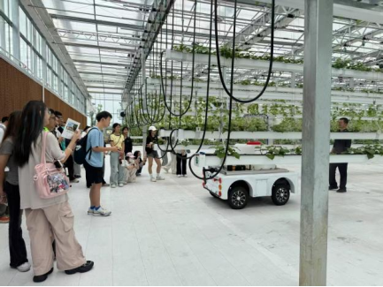员工们依次参观了人工智能调控的鱼池、现代化温室环境自动控制系统及AI模型驱动的水培基地,深入了解了物联网、AI技术在数据采集、环境调控、精准灌溉等方面的核心作用。通过工作人员讲解,大家学习了水培技术全过程并亲身体验了育苗移栽。在种植蓝莓、小西瓜的智能大棚中,同学们近距离观摩了基于AI监测的水肥一体化灌溉系统,部分同学还实际操作了智能喷药车。