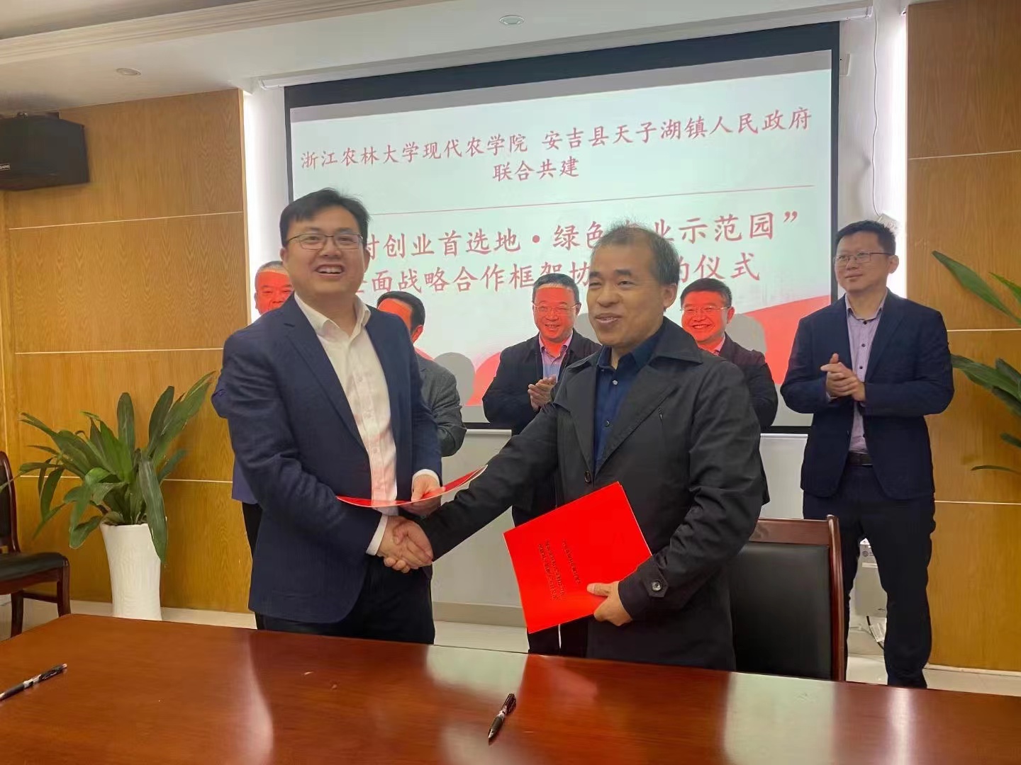 11月1日上午,公司一行到达安吉县天子湖镇,与天子湖镇签订了“乡村创业首选地•绿色农业示范园”全面战略合作框架协议,双方联合共建科研成果转化、种质繁育推广、人才联合培养、青年人才创业、青年农民培训、产业创新试验等6个示范基地,进一步放大高禹村“一村一品”品牌效应。