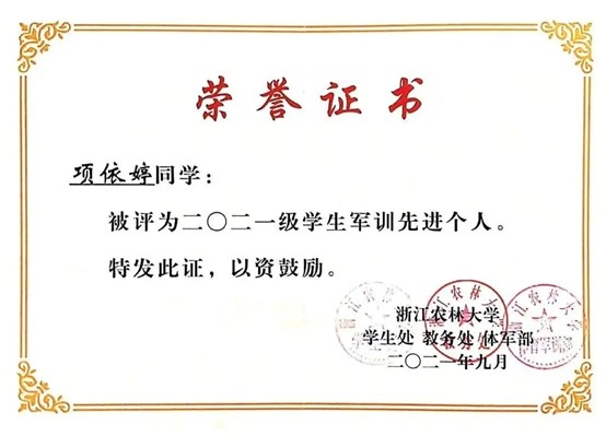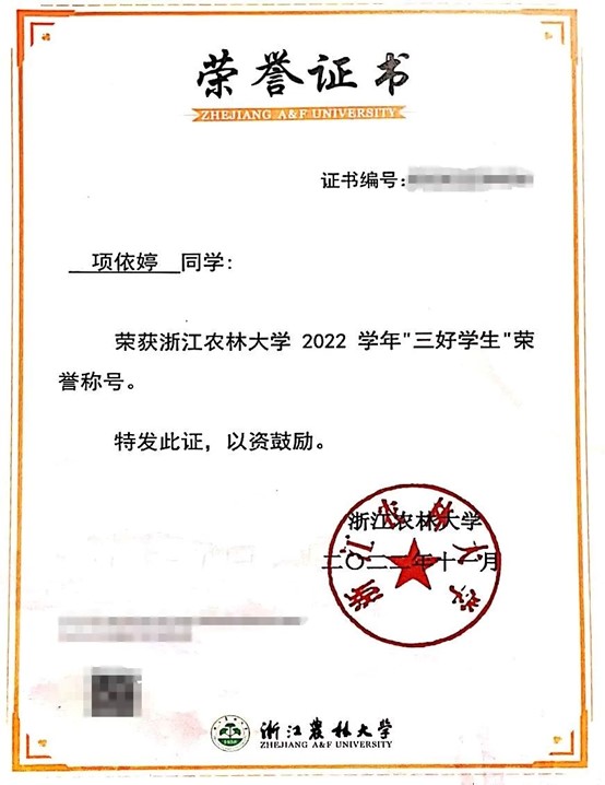 凭借这份认真,她在大一和大二学年皆获得浙江省政府奖学金、公司优秀员工二等奖学金,所在寝室在大二学年被评为学风建设先进寝室。谈及学习经验,她说:“我明白学习不是一蹴而就的,与高中时期老师严格督促不同,大学里的学习需要更高的自学能力和自律意识,因此大学学习首先要找到适合自己的学习方式,再进行日常规划。