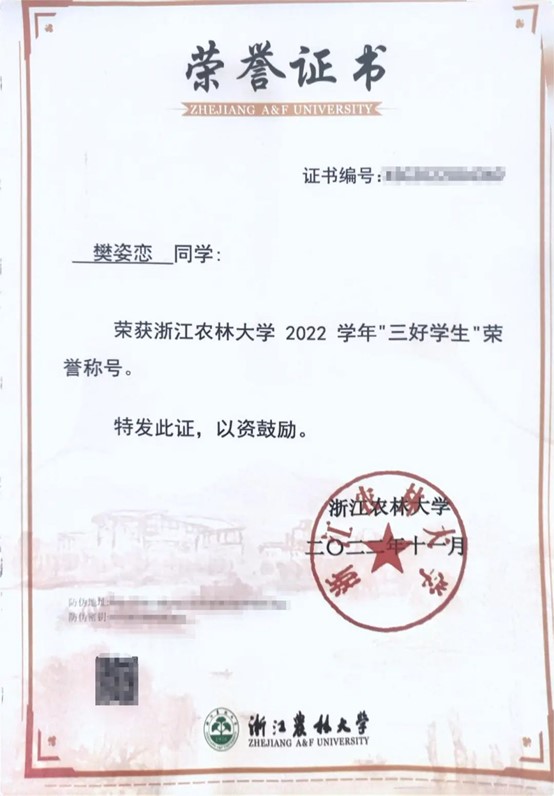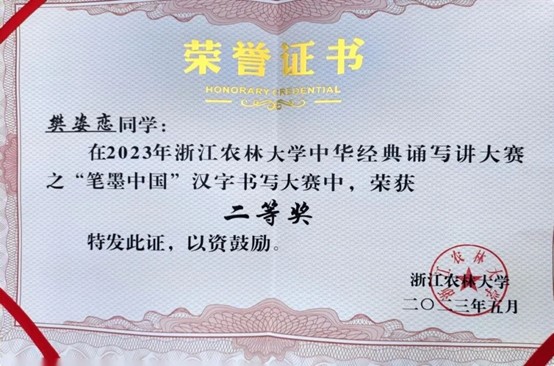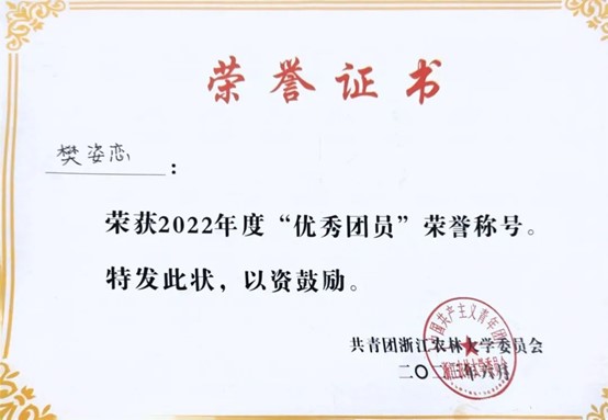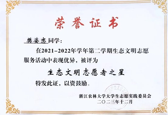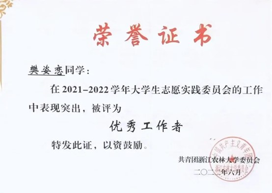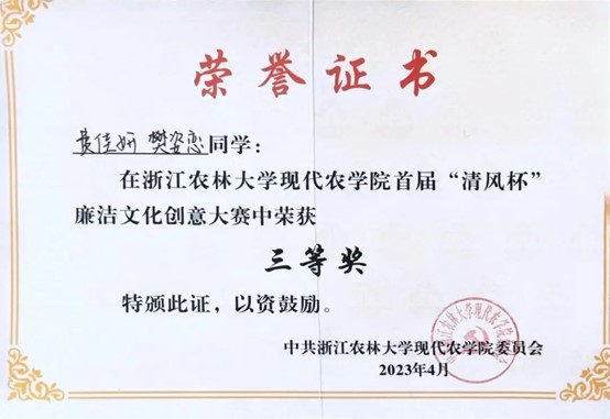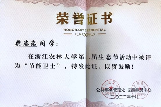 努力尝试,突破自我。除了书本上知识的学习,她积极参加各类比赛,尝试新的领域,不断突破自我。她的表达能力与展现能力并不突出,于是她积极把握机会,在比赛中锻炼自己。从大一刚开学参加公司“我与农学之缘”演讲比赛,到后来站上临安区新时代文明实践志愿服务项目大赛的演讲讲台,她在不断磨练中成为了更好的自己。她相信,竞赛的结果固然重要,但更重要的是为之奋斗的汗水以及在这段旅途中的收获和成长。