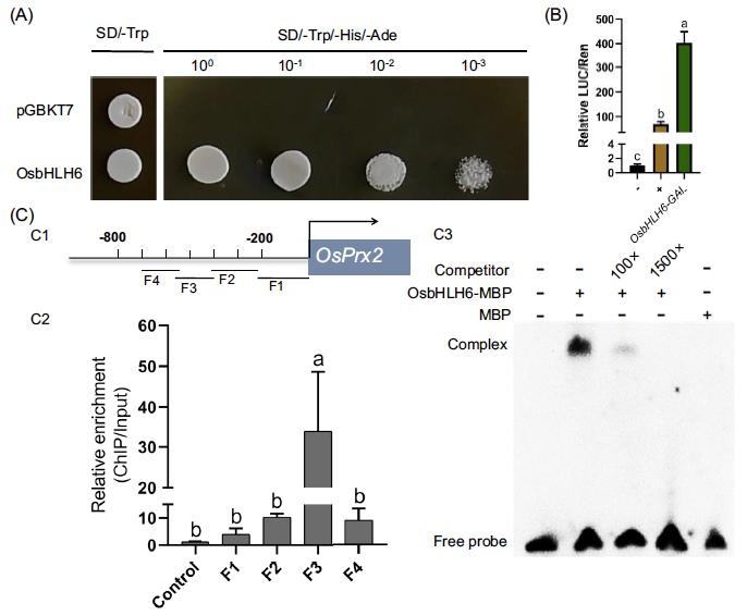 图2 OsbHLH6转录活性分析及与OsPrx2基因启动子互作的验证