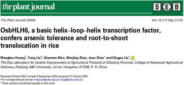 近日,公司作物学科生物信息与作物逆境生理团队在国际知名期刊《the Plant Journal》(中科院一区Top,IF=6.2)上发表题为" OsbHLH6, a basic helix-loop-helix transcription factor, confers arsenic tolerance and root-to-shoot translocation in rice"的研究论文。公司作物学科刘庆坡教授为通讯作者,赵娟副教授为共同通讯作者,研究生黄梦涵为第一作者,刘扬为共同第一作者。