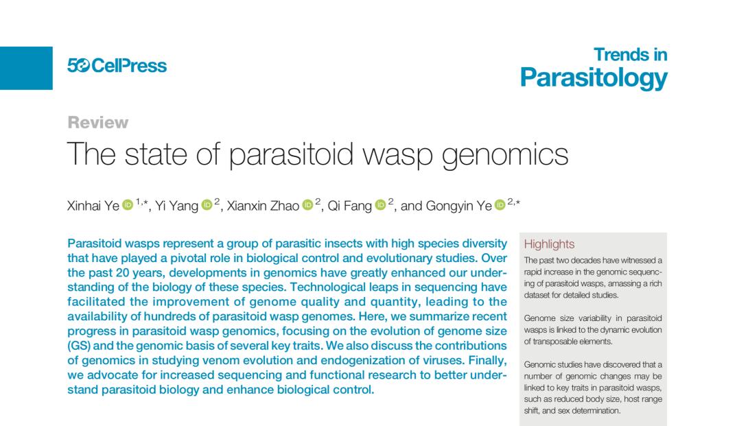 近日,叶昕海教授团队在Cell Press旗下权威期刊《Trends in Parasitology》(《寄生虫学趋势》)发表了题为“The state of parasitoid wasp genomics”的论文(DOI: 10.1016/j.pt.2024.08.003)。论文不仅系统地回顾了寄生蜂基因组测序的发展历程,还深入分析了当前的基因组数据现状。研究团队通过比较不同种类寄生蜂的基因组大小,揭示了它们在演化过程中的规律性变化。论文还重点讨论了基因组学如何帮助理解寄生蜂的重要性状演化,例如寄生蜂毒液如何适应不同寄主昆虫,以及寄生蜂内源性病毒的进化过程。此外,文章展望了寄生蜂基因组学的未来发展方向,提出了新的研究思路,包括如何利用基因组学技术提升农林重要害虫生物防治效率,推动农林重要害虫绿色可持续防控。