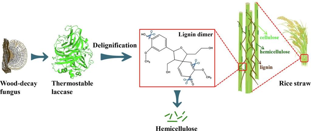 农业废弃物资源化利用对实现农业绿色发展有着重要作用。作为重要的木质纤维素生物质材料,水稻秸秆是一类丰富的可再生农业废弃物,全球每年约可产生7.3亿吨,它的资源化利用一直是人们关注的焦点。可是,水稻秸秆中的纤维素和半纤维素被木质素紧密包裹,使得难以利用。该论文另辟蹊径从一种白腐真菌(毛栓孔菌Trametes hirsuta)从中分离出一个属于F家族的耐热性漆酶,通过异源表达研究了该漆酶对水稻秸秆脱木质素的作用。结果发现,水稻秸秆通过纤维素酶→漆酶→半纤维素酶的三步连续水解,其还原糖产量能显著提高;漆酶可很好的解决降解外包裹的木质素问题,使得半纤维素得到释放。该研究引入漆酶建立的三步连续水解体系,增加了木质纤维素降解和利用机理的认识,为水稻秸秆的高值化利用提供新思路。