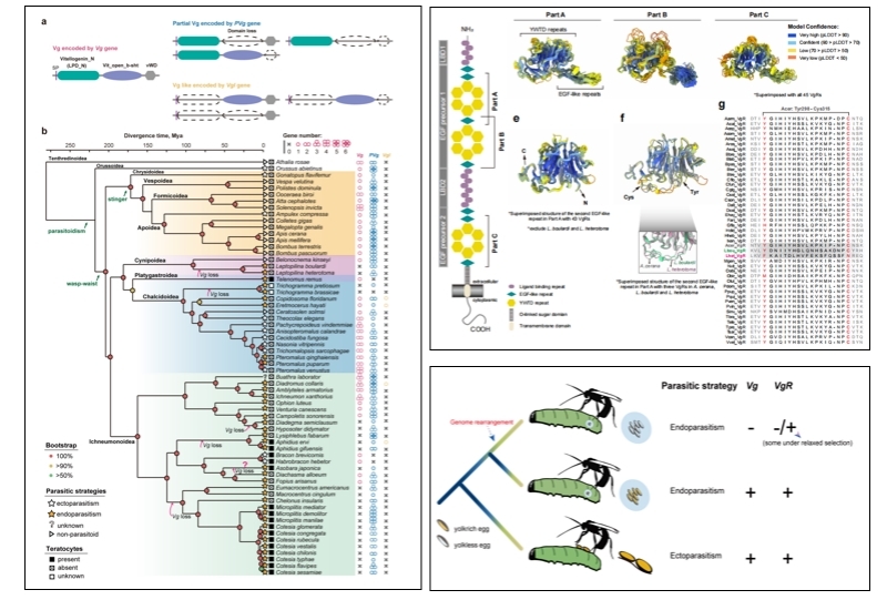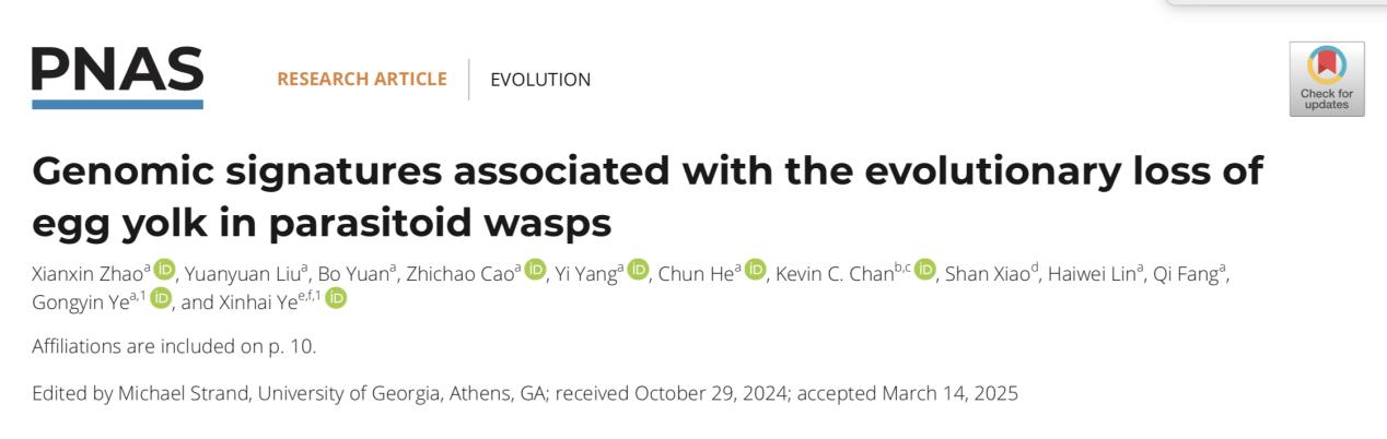 2025年4月16日,公司叶昕海教授团队与浙江大学合作在《美国国家科公司院刊》(简称PNAS,中科院1区Top,5年IF=10.8)上发表题为“Genomic signatures associated with the evolutionary loss of egg yolk in parasitoid wasps”的研究论文,通过比较基因组学手段,解开了困扰学界百余年的内寄生蜂卵黄蛋白演化之谜。