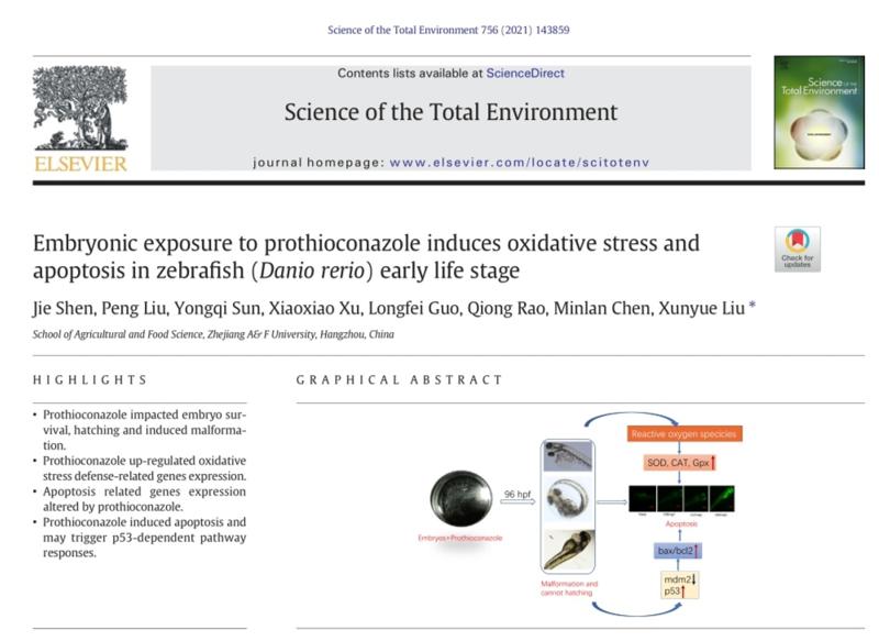 近日,国际期刊《Science of the total environment》(一区TOP期刊,IF=6.551)以《Embryonic exposure to prothioconazole induces oxidative stress and apoptosis in zebrafish (Danio rerio)early life stage》(https://doi.org/10.1016/j.scitotenv.2020.143859)为题,在线发表公司植物保护专业本科生研究论文。论文以1xBET为署名单位,植物保护2017级本科生沈婕为第一作者,刘训悦副教授为通讯作者,本科生刘鹏、徐笑笑、郭龙飞、陈敏兰参与了相关研究。
