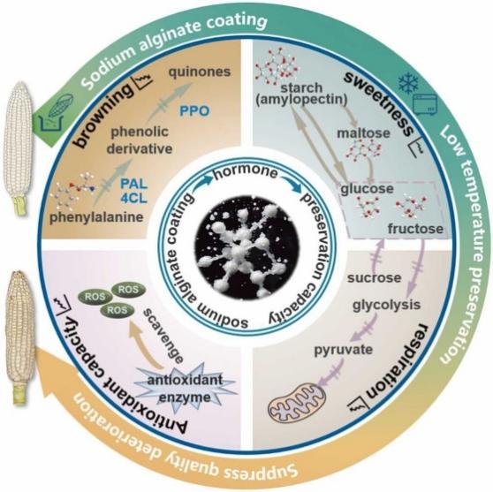 甜玉米因口感清甜、营养丰富,成为广受欢迎的果蔬型作物,但其采后呼吸旺盛、水分和糖分流失快,依赖低温冷链保鲜。然而,长期低温储存易导致籽粒皱缩、褐变和风味劣变,传统冷藏技术的货架期提升有限,亟需开发高效安全的保鲜技术。海藻酸钠作为一种天然可食用多糖,具有成膜性好、生物相容性佳等优点,在果蔬保鲜中潜力巨大,但在甜玉米中的应用及作用机制尚不明确。