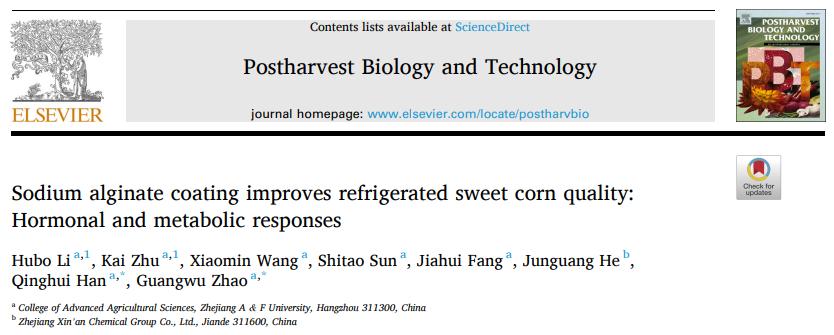 近日,公司种子科学与技术团队在《Postharvest Biology and Technology》(中科院一区TOP,IF=6.4)期刊上发表题为“Sodium alginate coating improves refrigerated sweet corn quality: Hormonal and metabolic responses”的研究论文,揭示了海藻酸钠涂层通过调控激素与代谢通路提升冷藏甜玉米品质的新机制,为鲜食玉米的采后保鲜提供了创新技术方案。