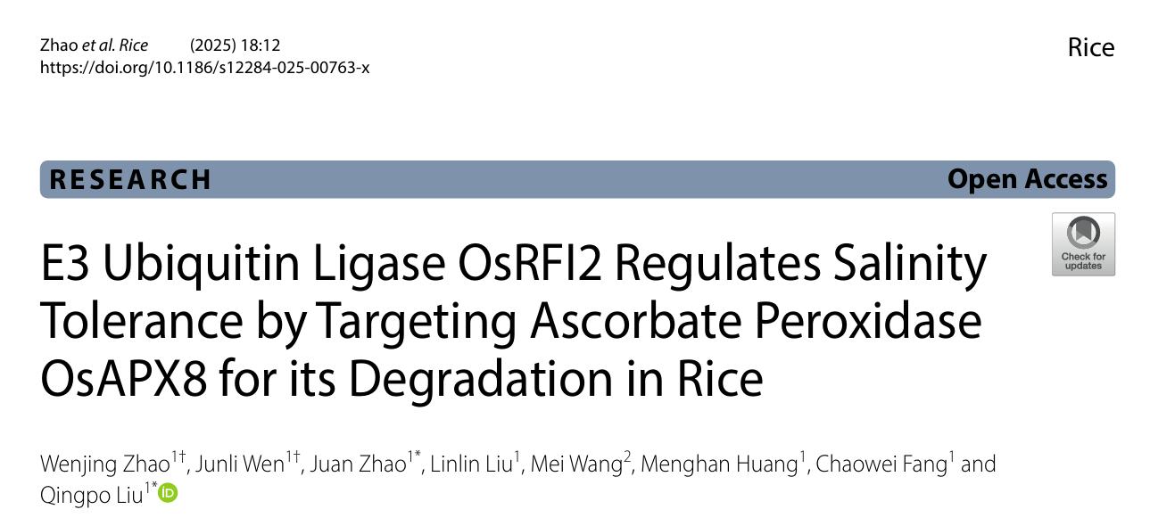 近日,公司作物学科生物信息与作物逆境生理团队在国际知名期刊《Rice》(中科院一区Top)上发表题为"E3 Ubiquitin Ligase OsRFI2 Regulates Salinity Tolerance by Targeting Ascorbate Peroxidase OsAPX8 for its Degradation in Rice"的研究论文。公司作物学科刘庆坡教授为通讯作者,赵娟副教授为共同通讯作者,研究生赵文静为第一作者,温俊丽为共同第一作者。