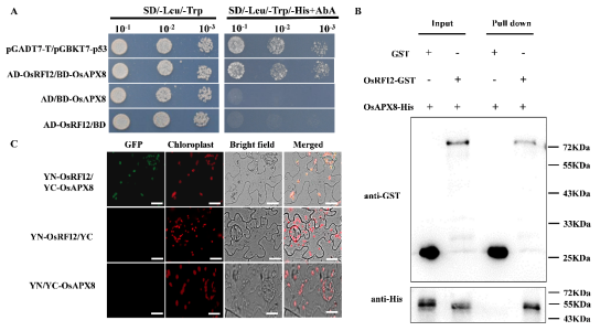 盐害是严重影响水稻生长和产量的非生物胁迫因素之一。在本研究中,我们鉴定发现一个RING-type E3泛素连接酶OsRFI2在水稻耐盐性方面就有负调控作用。OsRFI2的敲除突变体(Osrfi2)表现出较高的耐盐性,而OsRFI2过表达的转基因系(OE-OsRFI2)则对盐更为敏感。利用酵母双杂、BiFC、pull-down实验证明了具有E3连接酶活性的OsRFI2蛋白在叶绿体中与抗坏血酸过氧化物酶OsAPX8相互作用,并通过26S蛋白酶体途径催化其泛素化和降解。Osapx8突变体,与OE-OsRFI2相似,表现出对高盐浓度的高度敏感性,其受到盐胁迫后在植株中积累了更多的丙二醛、过氧化氢和超氧阴离子,导致细胞通透性受损和活性氧(ROS)的过量积累。OsRFI2-OsAPX8模块为阐明水稻中盐胁迫应答的调控机制提供了新的线索。