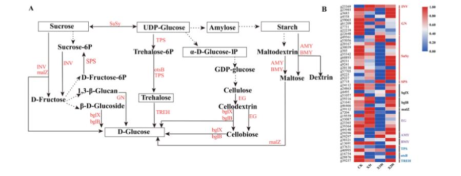 研究团队设计了四种短期生物炭施用处理(0 t·hm⁻²(CK)、5 t·hm⁻²(X5t)、10 t·hm⁻²(X10t)和20 t·hm⁻²(X20t)),通过综合分析生理数据和RNA测序数据,研究了生物炭对甘薯块根淀粉和蔗糖代谢的影响。