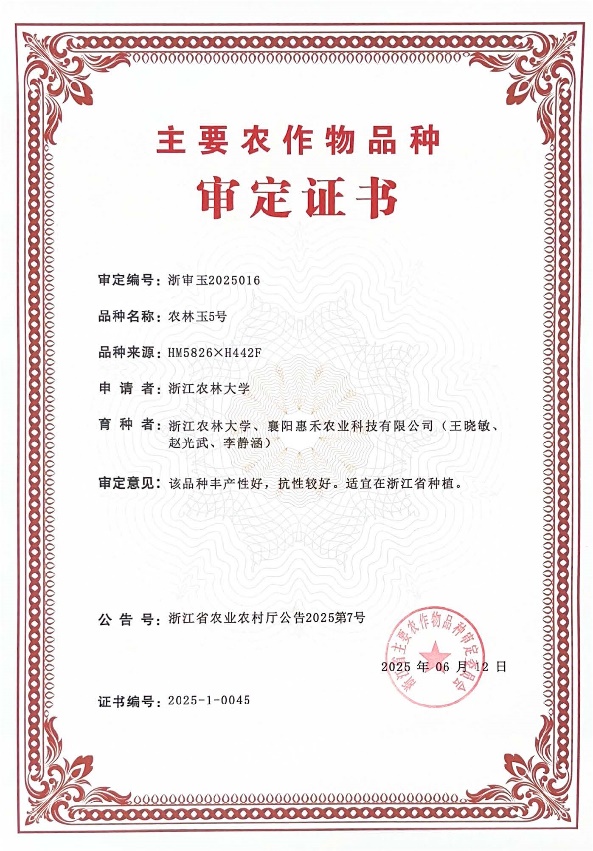 近日,浙江省农业农村厅发布公告(2025第7号),由公司种子科学与技术团队自主选育的玉米新品种‘农林玉5号’通过浙江省农作物品种审定,审定编号为浙审玉2025016。